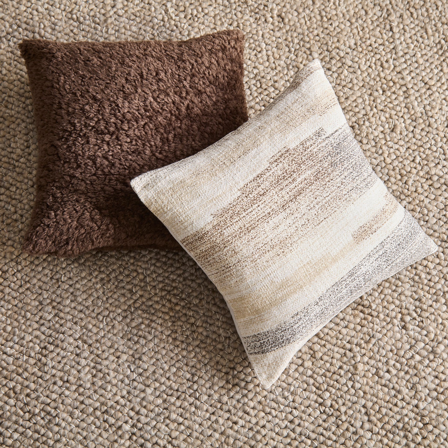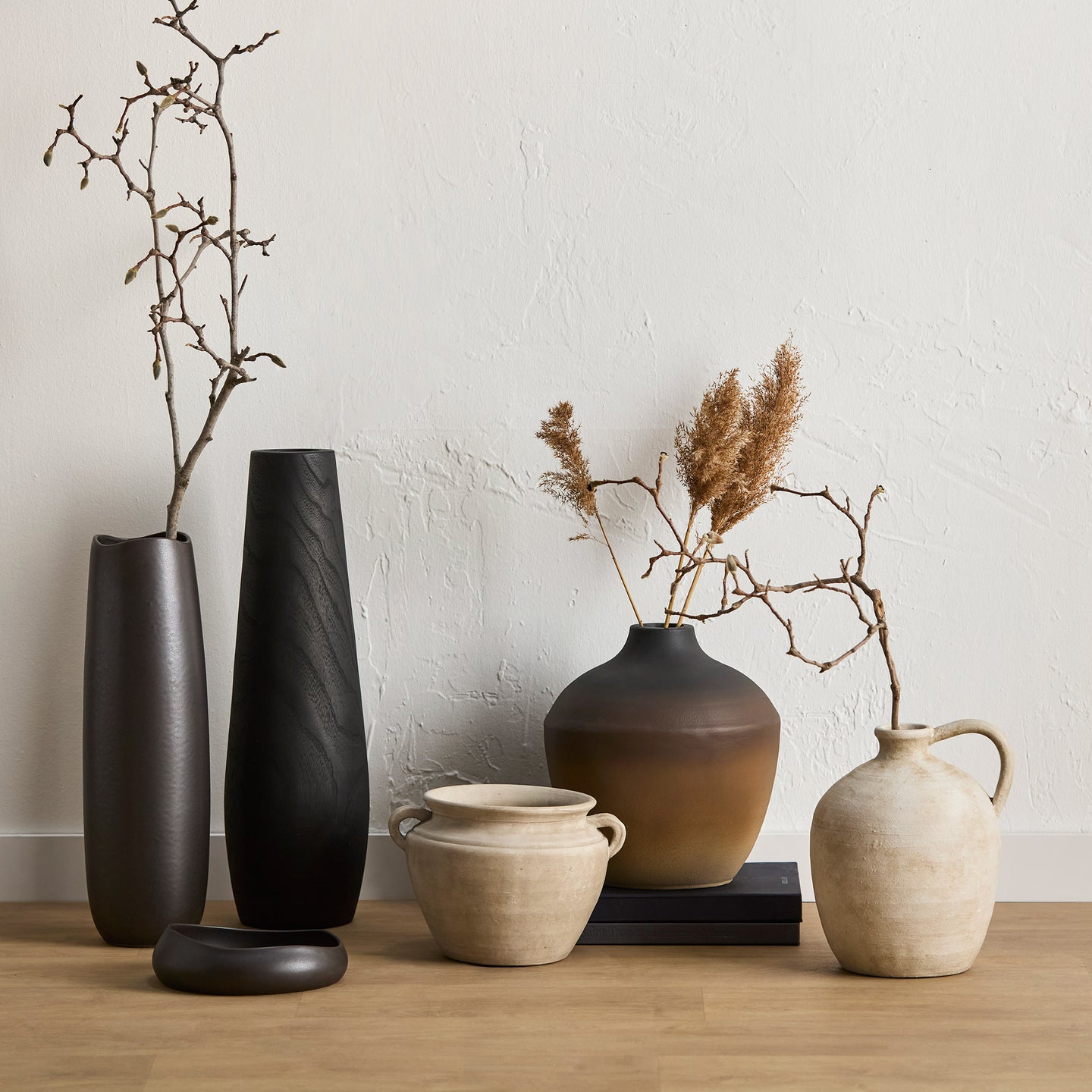 A palette of neutrals, dark brown, and gold accents adds richness and depth.